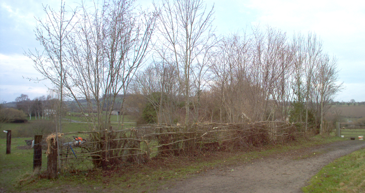 The same hedge (pictured right) after it has been cleaned, stripped of brambles and ivy, coppiced and then laid. Some of the largest ash boughs will probably be coppiced next year. The ivy has been cut through at ground level and although the remains are still visible higher up in the ash trees, it will soon die off. The laid hedges are already perfectly stock-proof but could benefit from more attention in a year or two when there are new young saplings to be incorporated into the lower levels of the hedge.