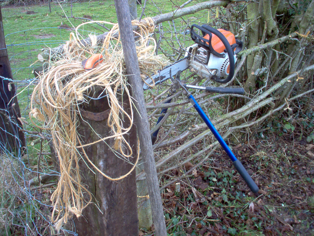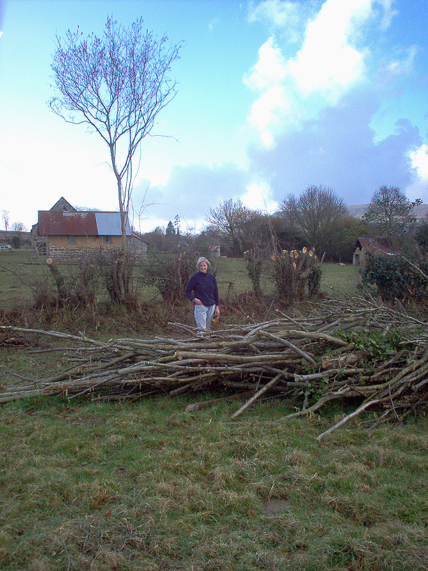 As you cut through your 10 cms poles, drag them out of the hedge and lay them in a line parallel with the hedge but at least four or five metres away (to leave a working passage along the hedge-line) with all their heads pointing in towards the hedge.
