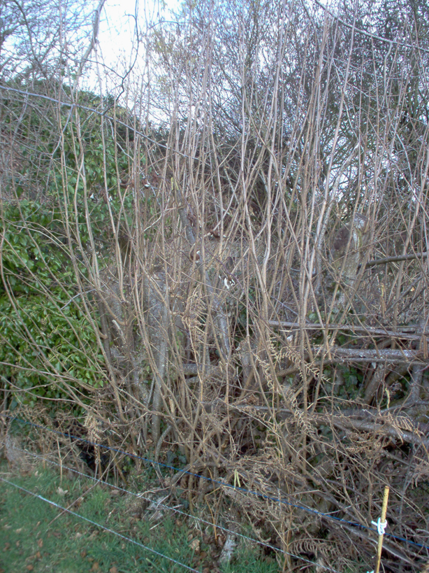 It's easy to spot brambles in winter: they tend to keep many of their old green leaves which are clearly visible among the bare branches of hazel, ash, etc. Brambles do of course have their own valuable place in hedgerows, but only provided that they do not to climb into the tops of trees and suffocate them!