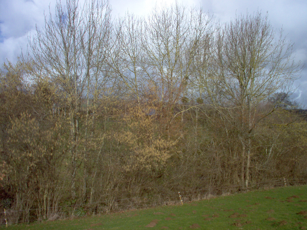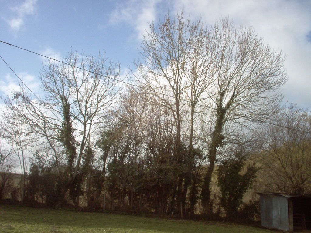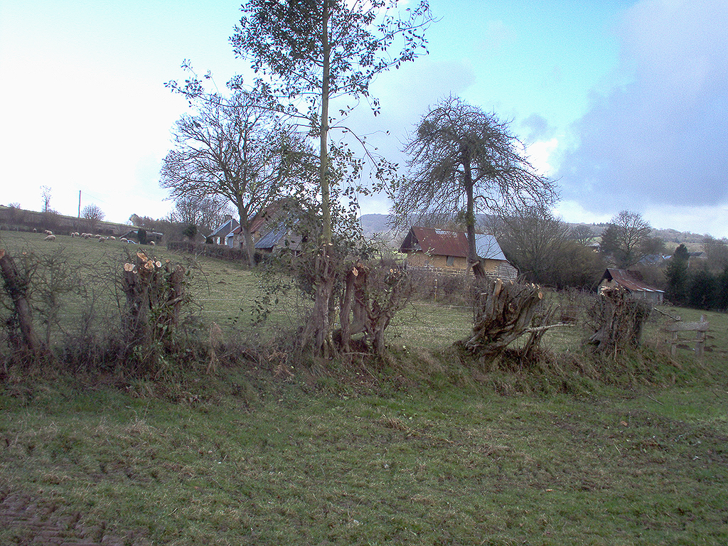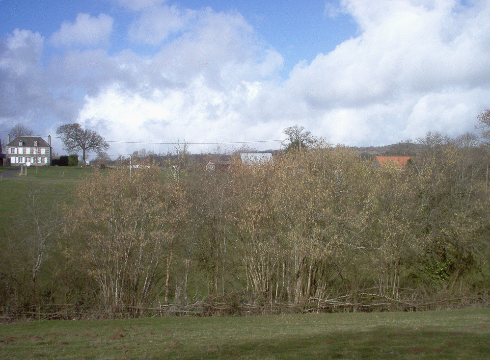 This stretch of hedge (above right) has probably not been touched for 20 years. Because it has not been coppiced or laid for so long, it grows very lethargically. It consists (left to right) of hazel, blackthorn, some stunted beech, an ash tree (which had its head chopped off by contractors laying electric cables overhead), hawthorn and several stands of hazel. This hedge has already been cleared of brambles. The ash tree is not ready for coppicing but the hazel and thorn could be laid to fill the gaps. Ideally the gaps should also be planted with a selection of coppice-woods (e.g. chestnut and willow) and the earth bank (known in Normandy as a talu and familiar to the English as a Devon bank) needs restoration.