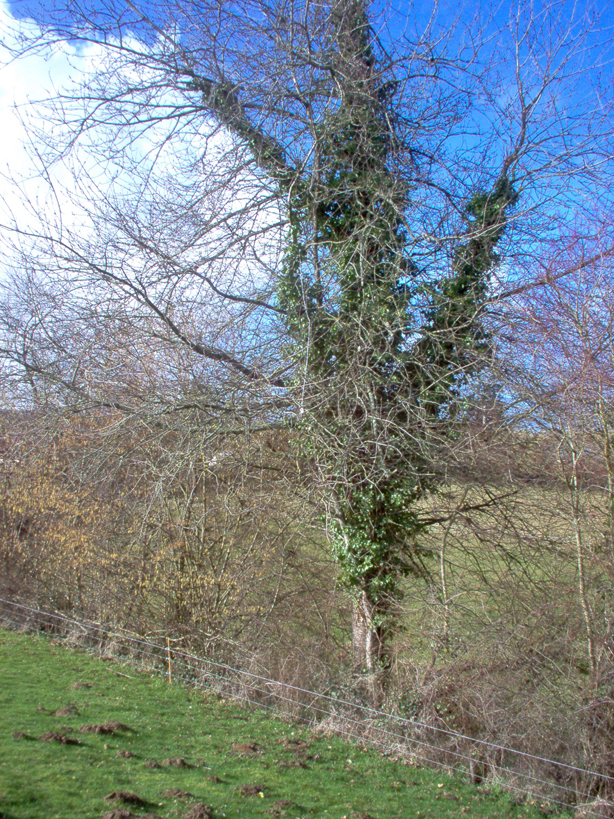 F = The large wild cherry tree is being steadily smothered by ivy. While certain species of birds depend on ivy-clad trees like this, drastic action needs to be taken. This requires cutting through the 'trunk' of the ivy in two places about 10 cms apart and removing the section. Ivy very often attacks trees that have been damaged or scarred. The mangling effects of agricultural hedge cutters are responsible for a great deal of damage, as was the case with this cherry.