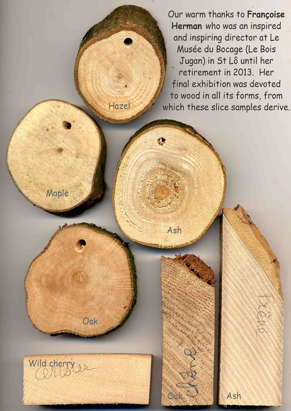 When the Musée du Bocage at the Bois Jugan in St Lô, Normandy, mounted an exhibition on 'wood' (in all its forms), it provided hundreds of cross-section slices of a variety of common trees which allowed visiting children to keep a sample of their favorite tree on a string around their necks.