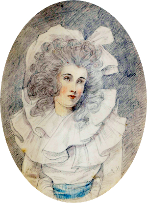 According to Lord Hood (in 1987) this too is "probably a portrait of the Duchess of Devonshire" [Georgiana 1757-1806]. It is a delicately worked pen & wash (rather better than the copy of the Cosway portrait, above) and again may be a copy of a larger formal portrait.