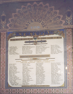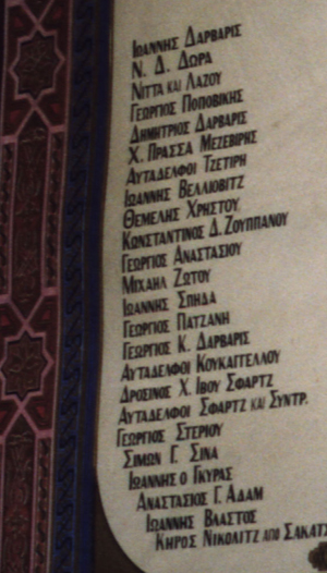 The names of the original founders and those who contributed to the church's foundation thereafter, notably the Zarifi family, are inscribed on stone panels in the entrance hall of the present church.