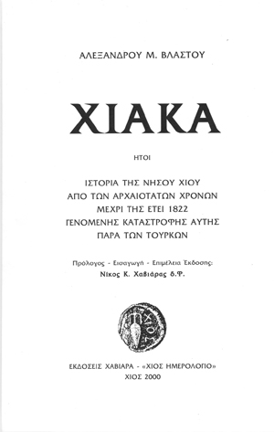 Xhiaka A History of the Island of Chios AD 70-1822 was first published (top) in Greek in Ermopolis, Syros, 1840, then in English translation by J. Davy & Sons, Dryden Press, London, 1913 and re-published in Greek by Nicolas Chaviara of Chios, Greece in 2000 (ISBN 960-86686-03).